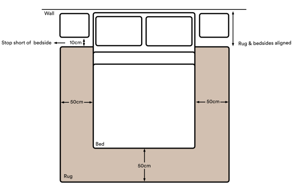 Start your rug around 10cm from your bedside tables (depending on your bed and room size). This means your rug will sit underneath the lower two-thirds of your bed and stretch out beyond the foot of the bed.